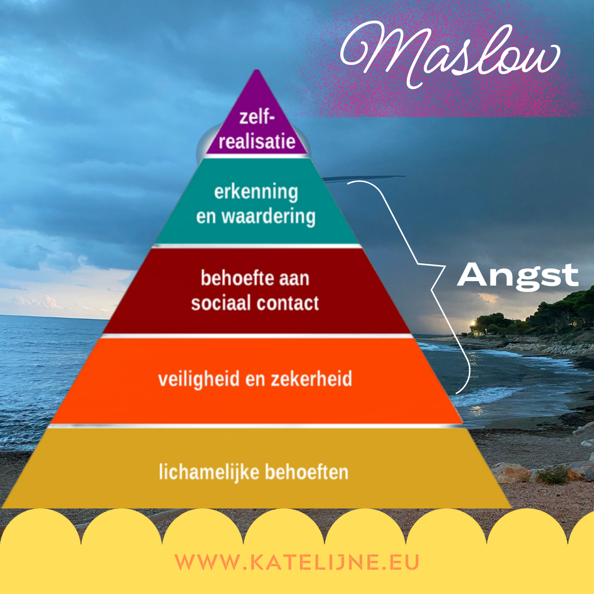 En dus vechten we elke dag opnieuw tegen de angst van bovenstaande 3 zaken uit dezelfde piramide van Maslow.